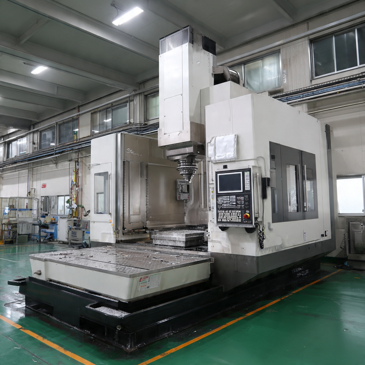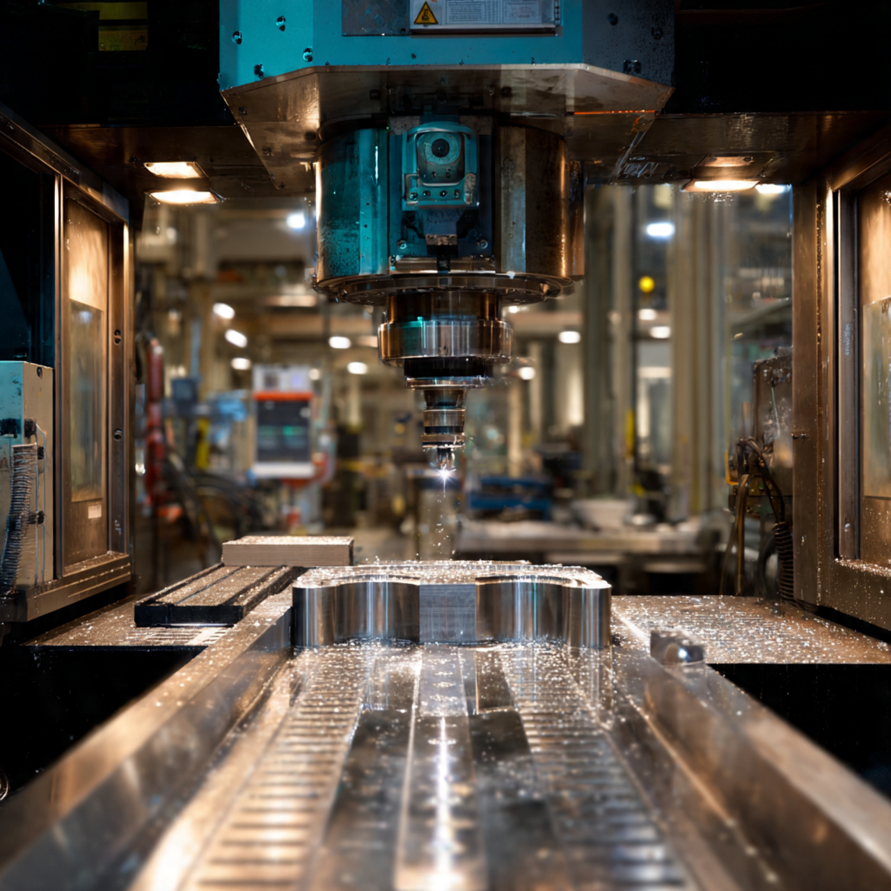 (Chú thích: Toàn cảnh xưởng phay CNC hiện đại, máy 5 trục đang vận hành chi tiết thép công nghiệp.)