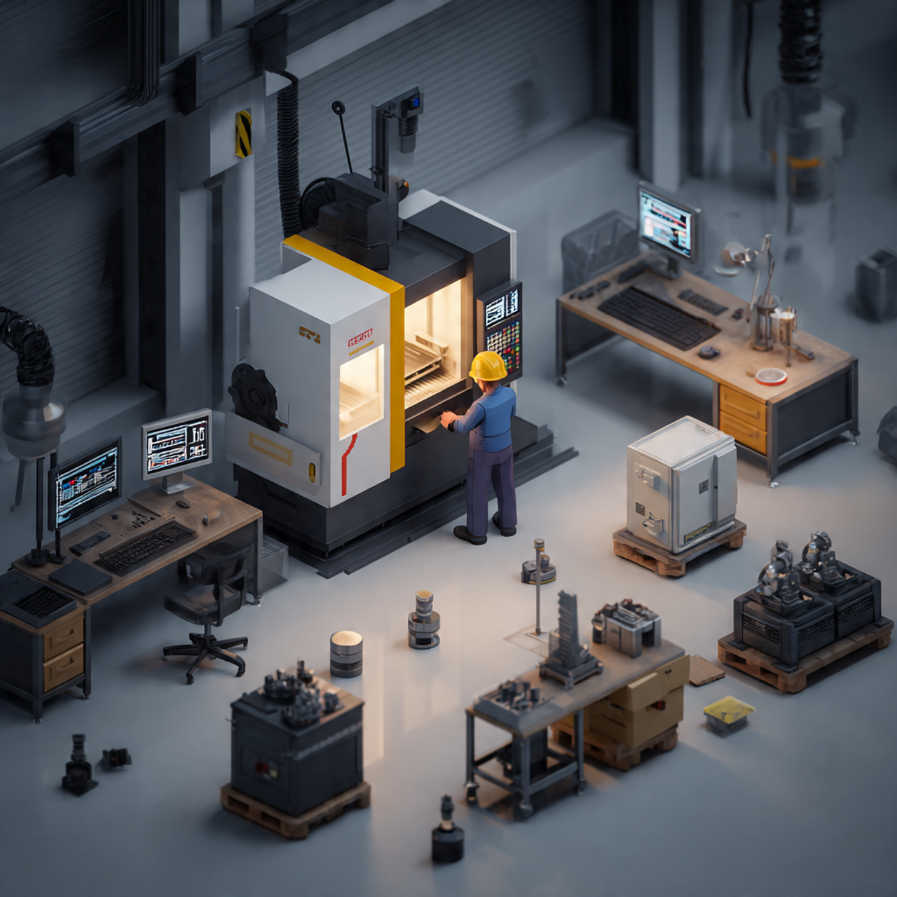 📸 Hình 2: Mô phỏng quy trình lập trình và vận hành máy phay CNC tại xưởng.